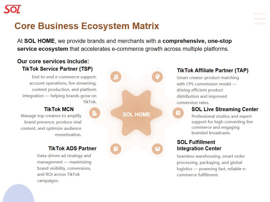 End-to-end e-commerce support: account operations, live streaming, content production, and platform integration — helping brands grow on TikTok.